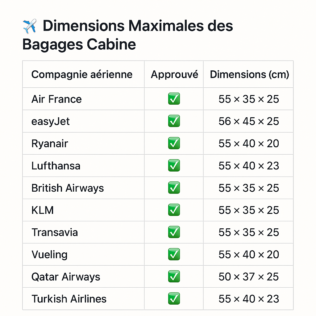 Respecte les dimensions cabine — évitez les frais imprévus à l'aéroport